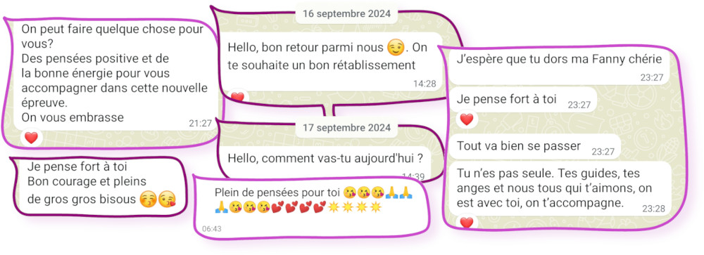 J’ai beaucoup apprécié recevoir des messages de soutien et de bon courage pour l’opération de la part de ma famille et de mes amis. Je me suis sentie aimée et soutenue.